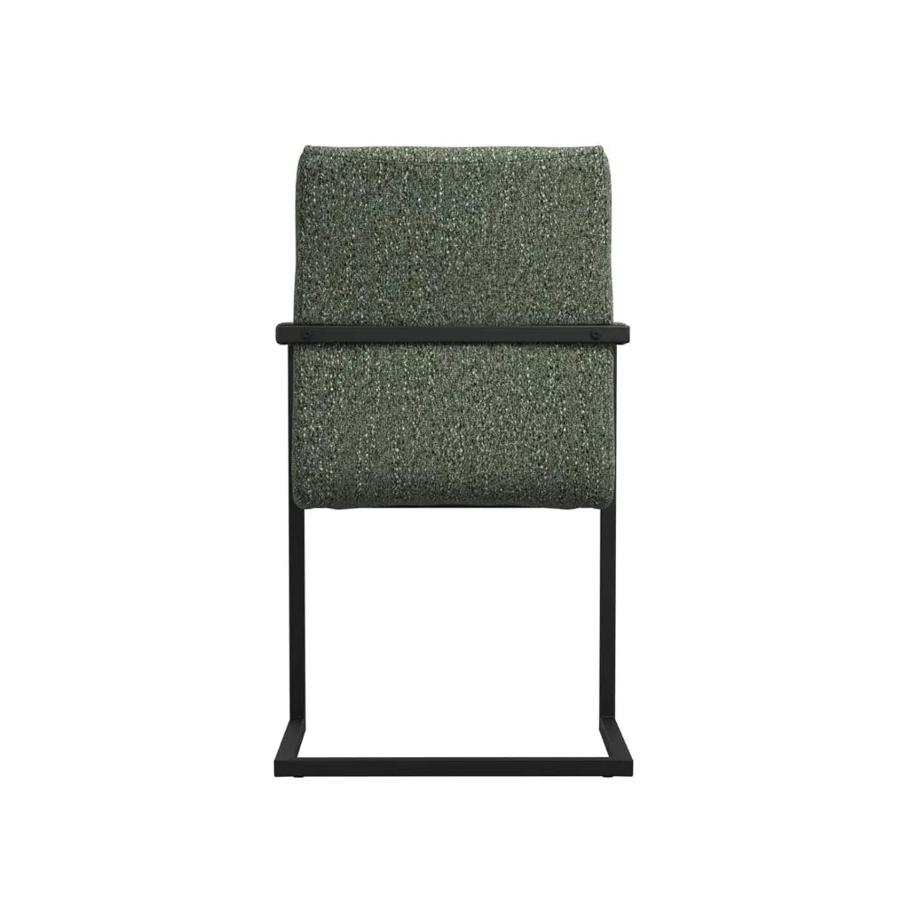 Supported by a sleek matte black metal frame with cantilever legs, the chair provides both durability and visual lightness. The fabric wrapped arms enhance comfort, while the padded seat and backrest ensure supportive seating for relaxed dining. A subtle button detail on the backrest adds an extra touch of sophistication and design interest.